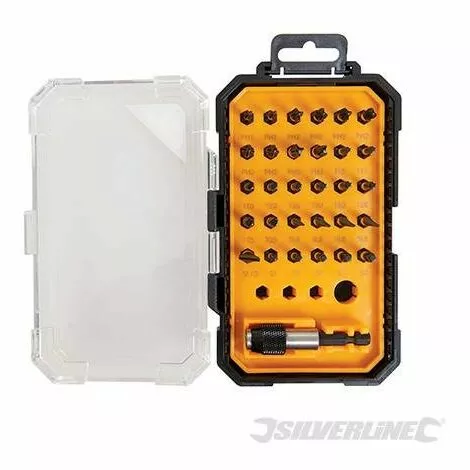 Embouts pour visseuse à chocs en acier S2 de première qualité pour couples élevés. Moindre risque de cassure et durée de vie prolongée. Parfaits pour perceuses et visseuses à chocs. Fournis : embouts Philips (2 x PH1, 6 x PH2, 2 x PH3) ; plats (1 x SL6, 3 x SL8, 1 x SL10) ; Trx (2 x T15, 6 x T20, 2 x T25) ; carrés (1 x n°1, 2 x n°2, 2 x n°3) et 1 x porte-embout magnétique de 60 mm.