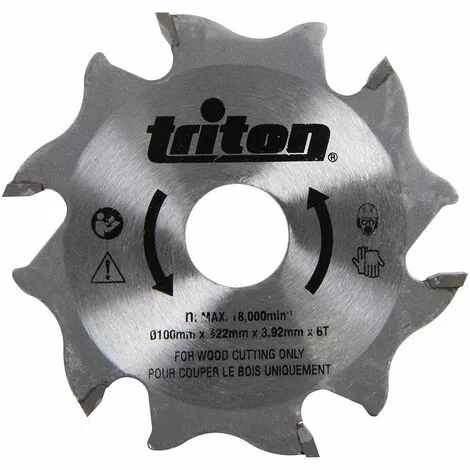 6 dents durables, brasées, en carbure de 3,92 mm. Épaisseur de la lame de 3 mm. Max. 18 000 min-1. Ø22 mm alésage. Lame de remplacement de Ø100 mm pour le coupe-lame Triton TBJ001.